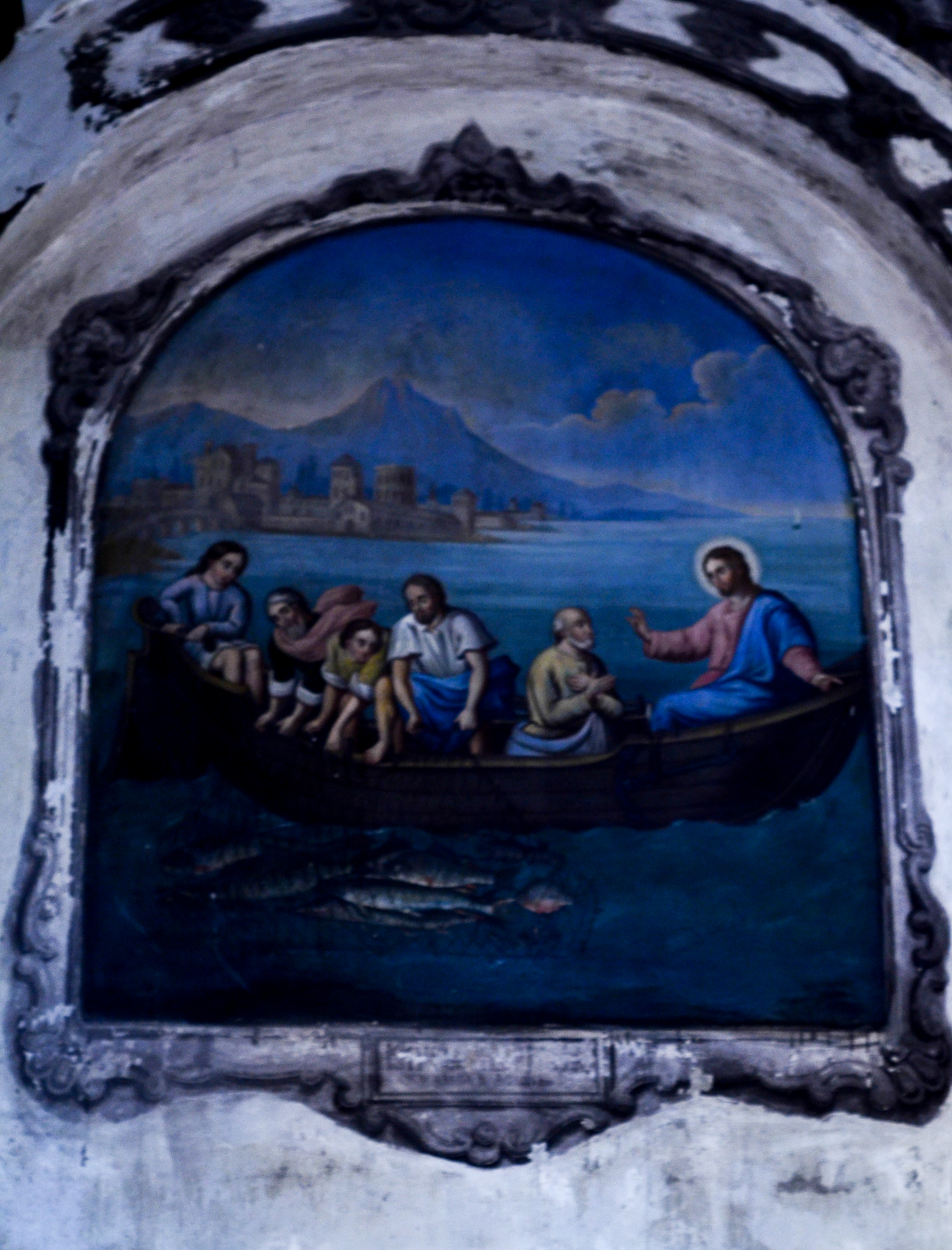 I pesci nella chiesa di San Nicola, nell’affresco di un episodio del Vangelo che non sono in grado di evocare, nè ora ne poi. Forse uno di loro saltò nella barca, forse.