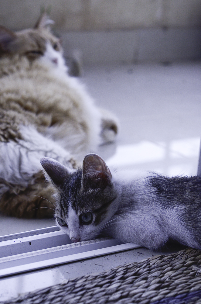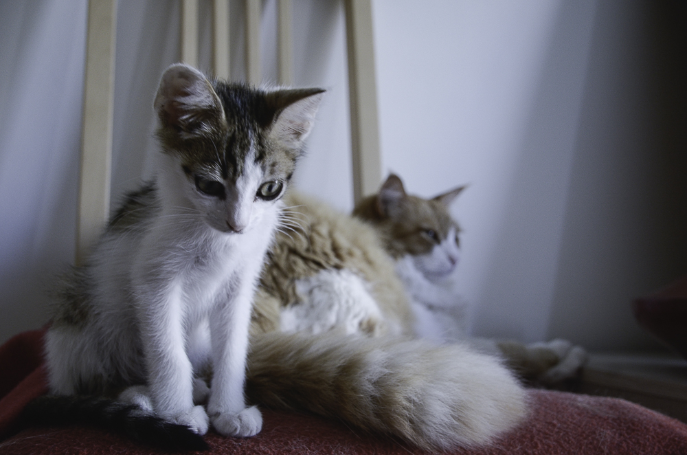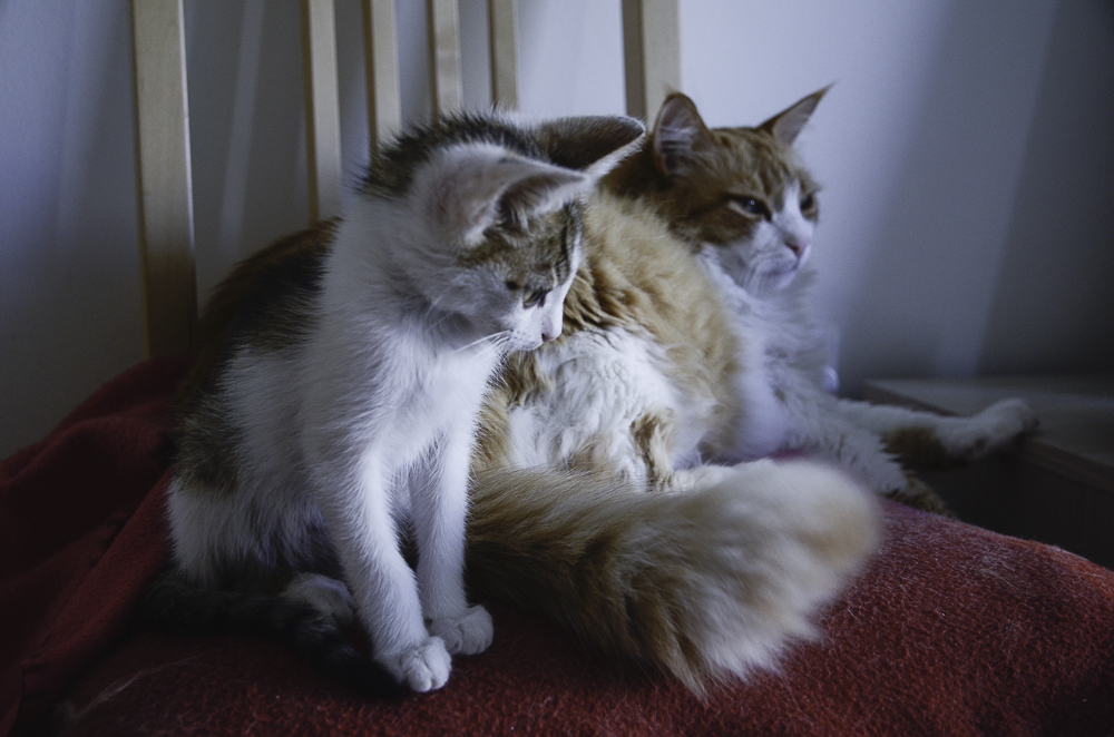 Ora che finalmente scadenze e impegni di lavoro hanno perso un po’ di peso, posso finalmente dedicarmi al catwatching, alla miciografia, all’osservazione partecipante, chiamatela come volete, di queste due affascinanti, elusive e morbide creature che popolano casa: Olivia – gatta magnifica, maestosa, affettuosa a sua discrezione – e Duke Orsino, trovatello dolcissimo, affamato e dalle lunghe zampette. La convinvenza non è facilissima, i tempi di accettazione e tolleranza di Olivia (che è con me da otto anni) nei confronti di Orsino (con noi da appena tre settimane) oscillano tra l’incoraggiante, il tenero e l’irrimediabilmente disarmante. Magari il tempo, e mesi più freddi, la faranno avvicinare al neo micetto. Nel frattempo, sono adorabili anche quando lui vuole per forza afferrarle la coda, le ruba il cibo, le occupa tutte le scatole, le nasconde i giochi sotto al divano, e quando lei soffia, sbuffa, si allontana come una diva e lascia intendere che cambierà la serratura la prossima volta che usciremo.
